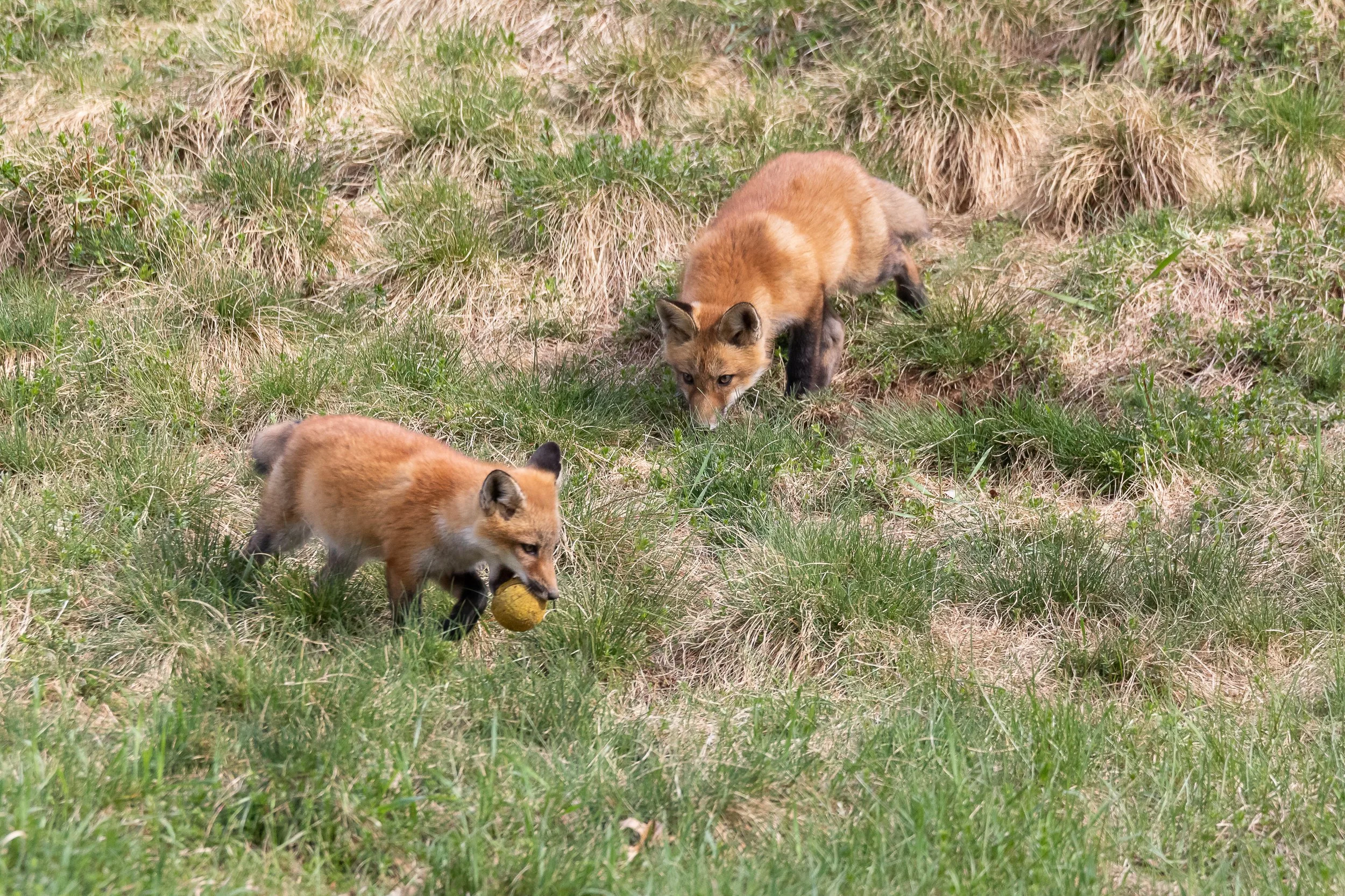 These fox kits must have stolen some kids ball and were playing catch and fetch with it!