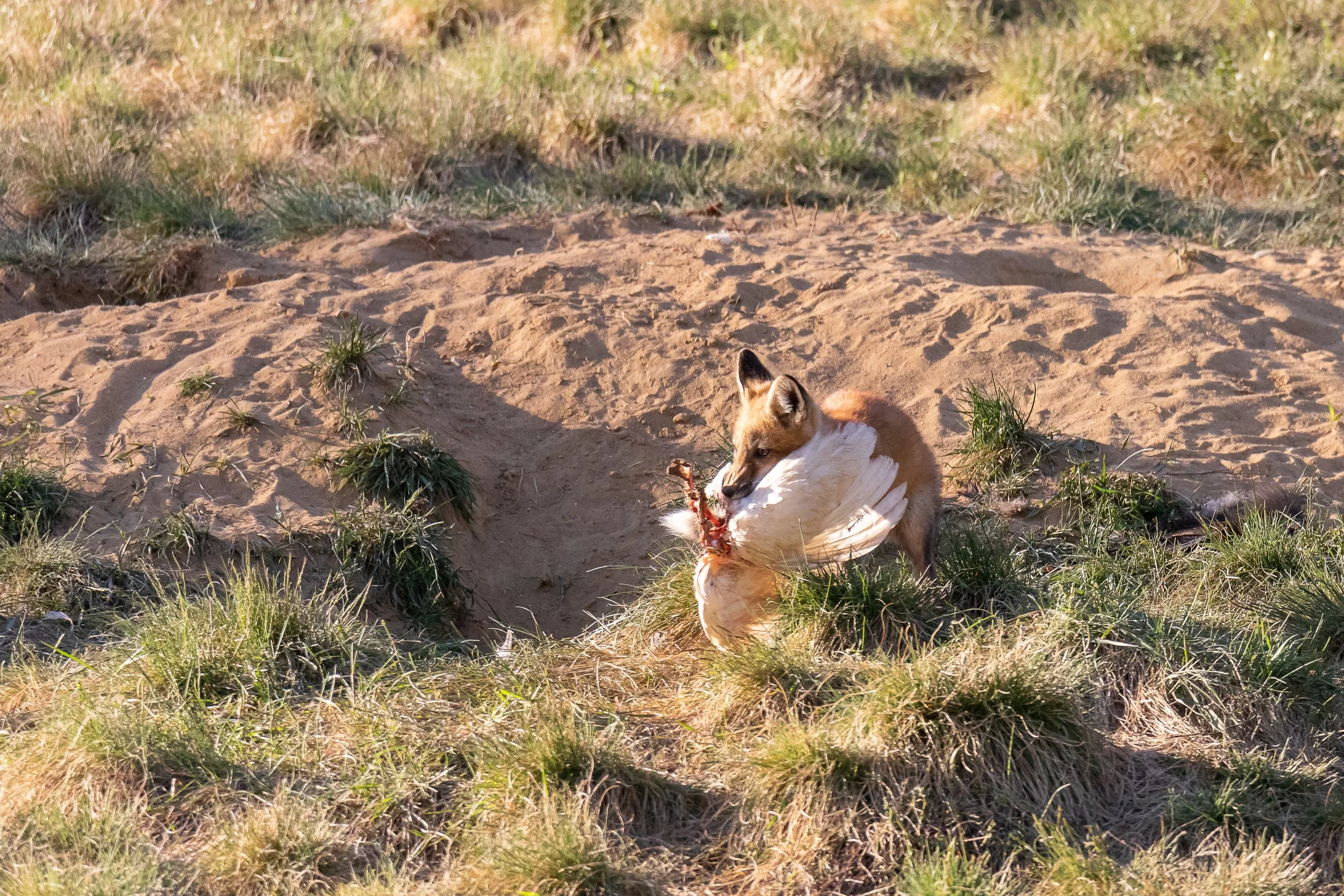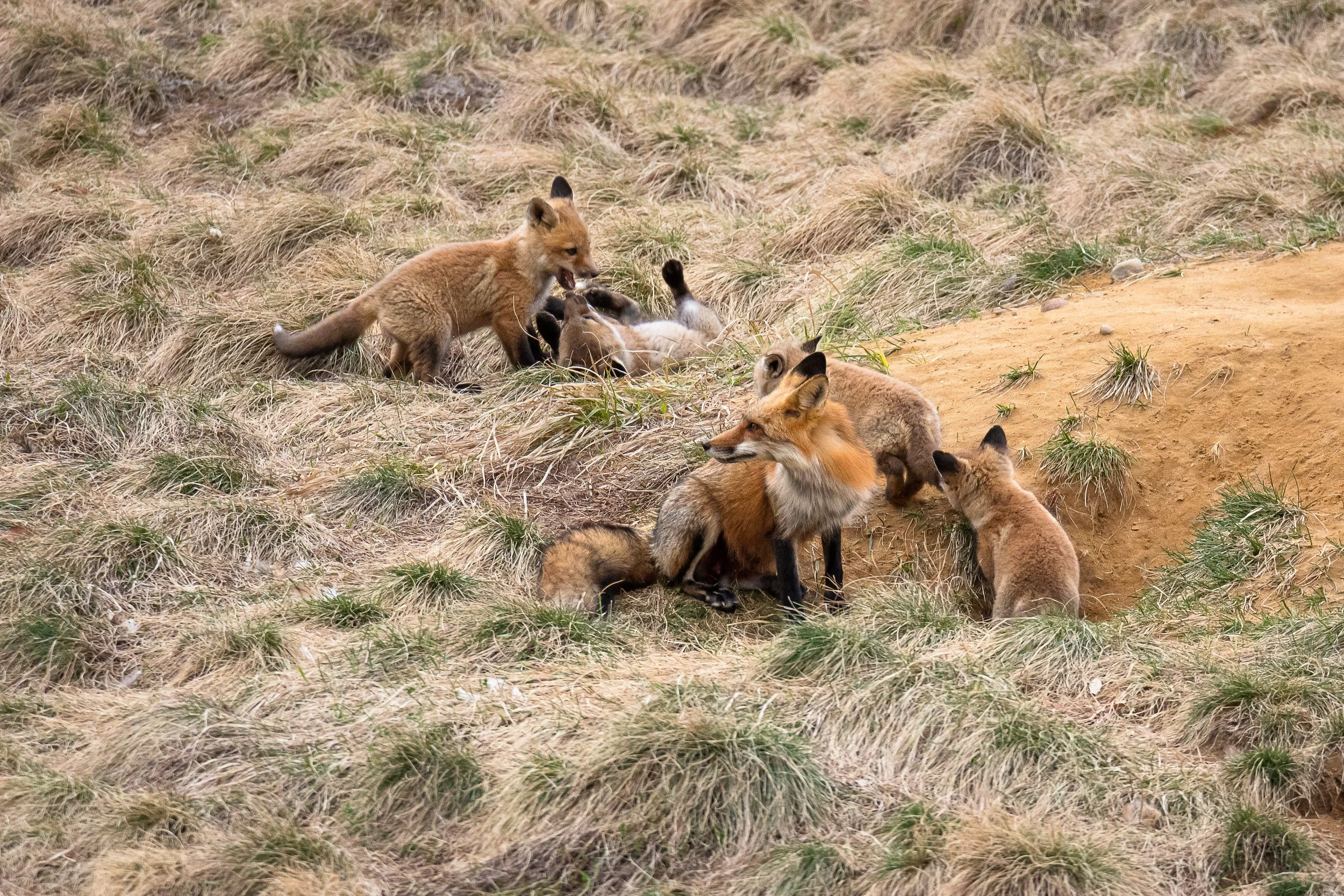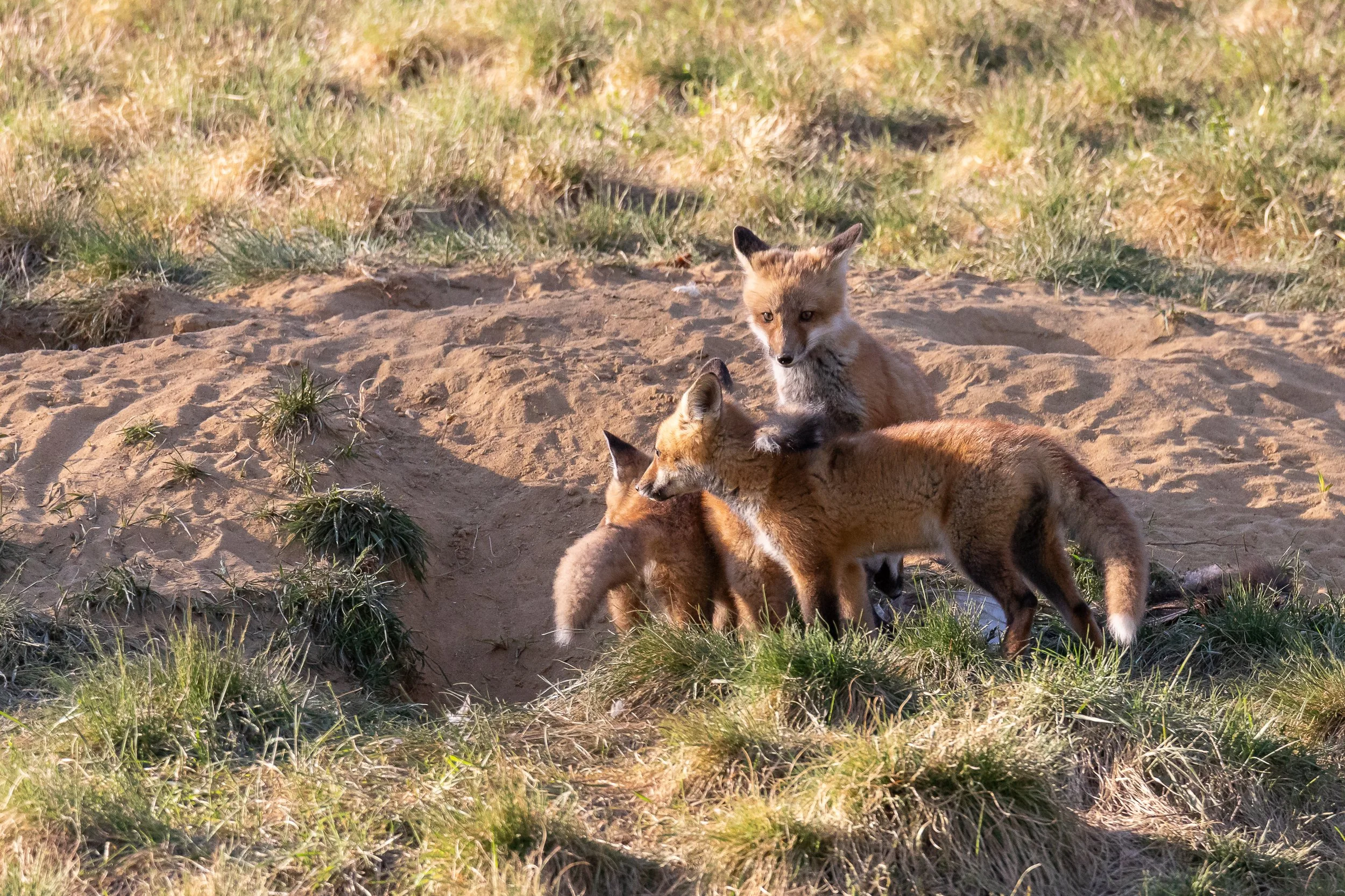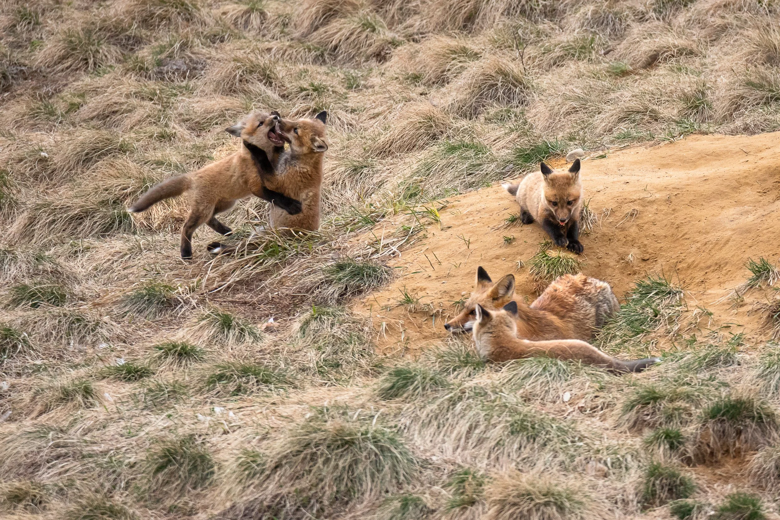 Photographing fox dens will be a many day and week endeavor. Start by keeping more distance than you think is necessary and read their behavior and let them see you aren’t a threat. If they are disturbed or go hide in their den it likely that means you have spooked them. Return several times and if they are comfortable you can try to get maybe 50 to 60 meters away for a place to set up. This seems to be a good distance that doesn’t bother the foxes. You can check the distance by manually focusing your lens as most these days will tell you how many meters away you are focused. If the foxes are playing, eating, and resting in the open you know you are doing it right and will get tons of fun images like these below.